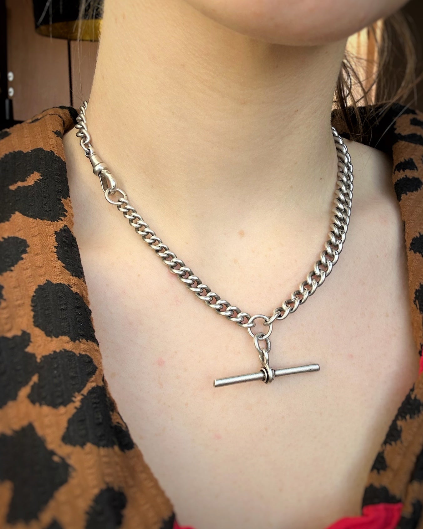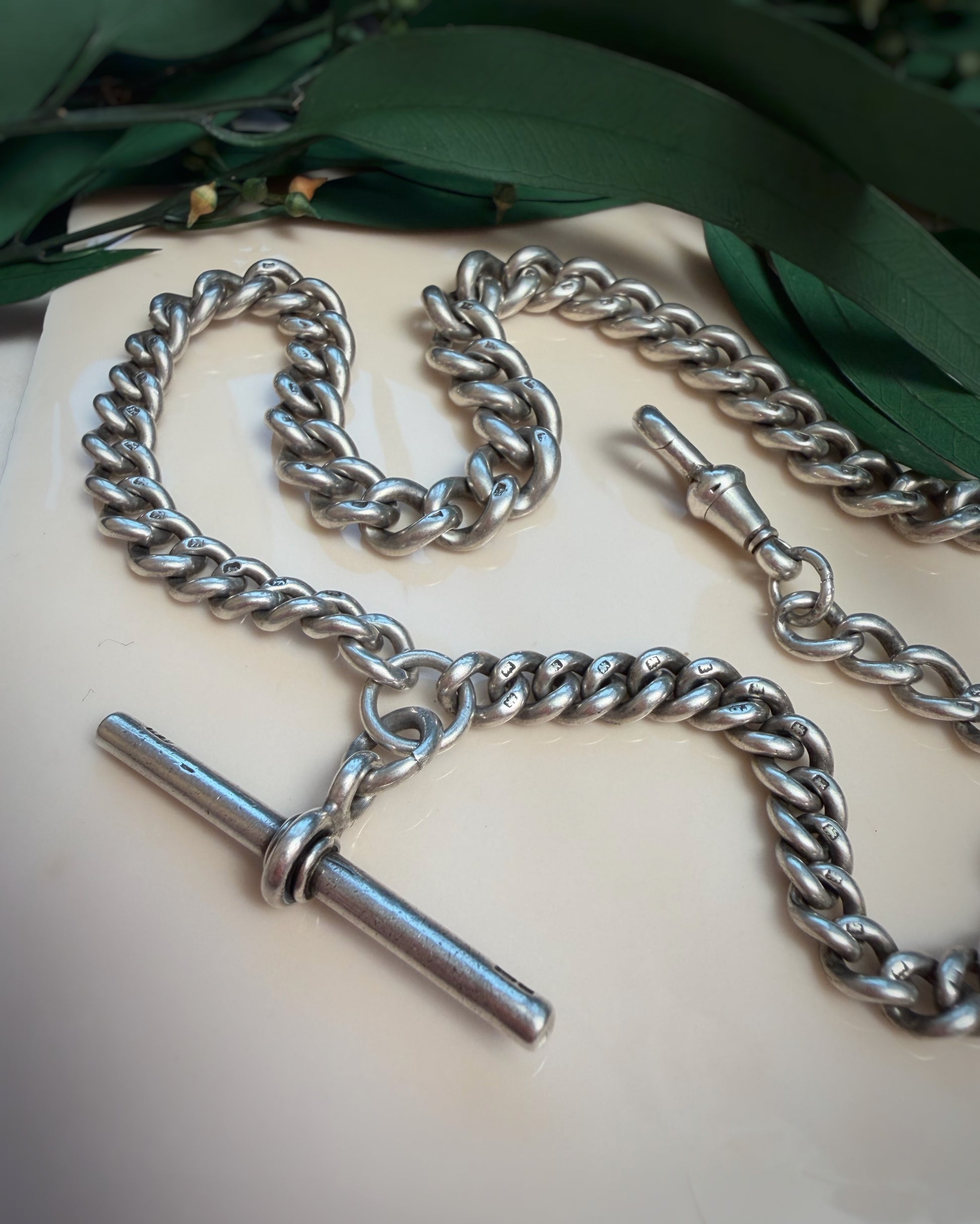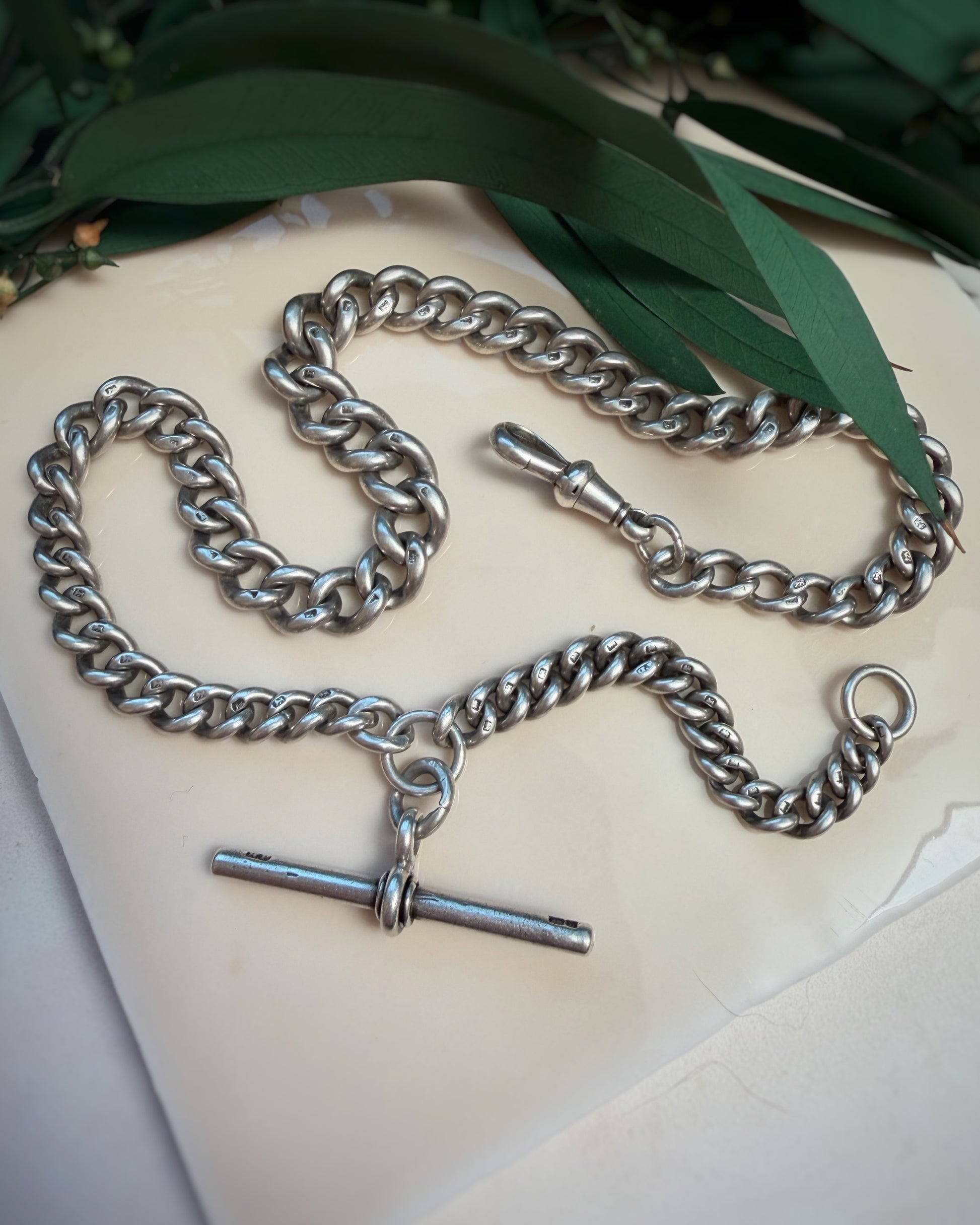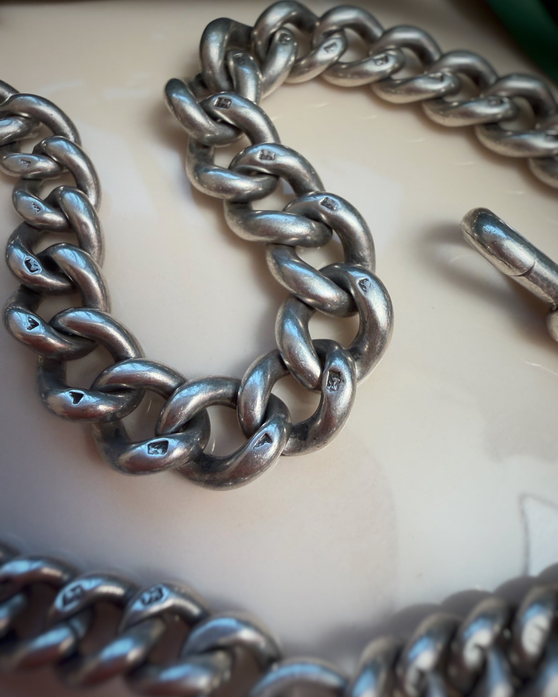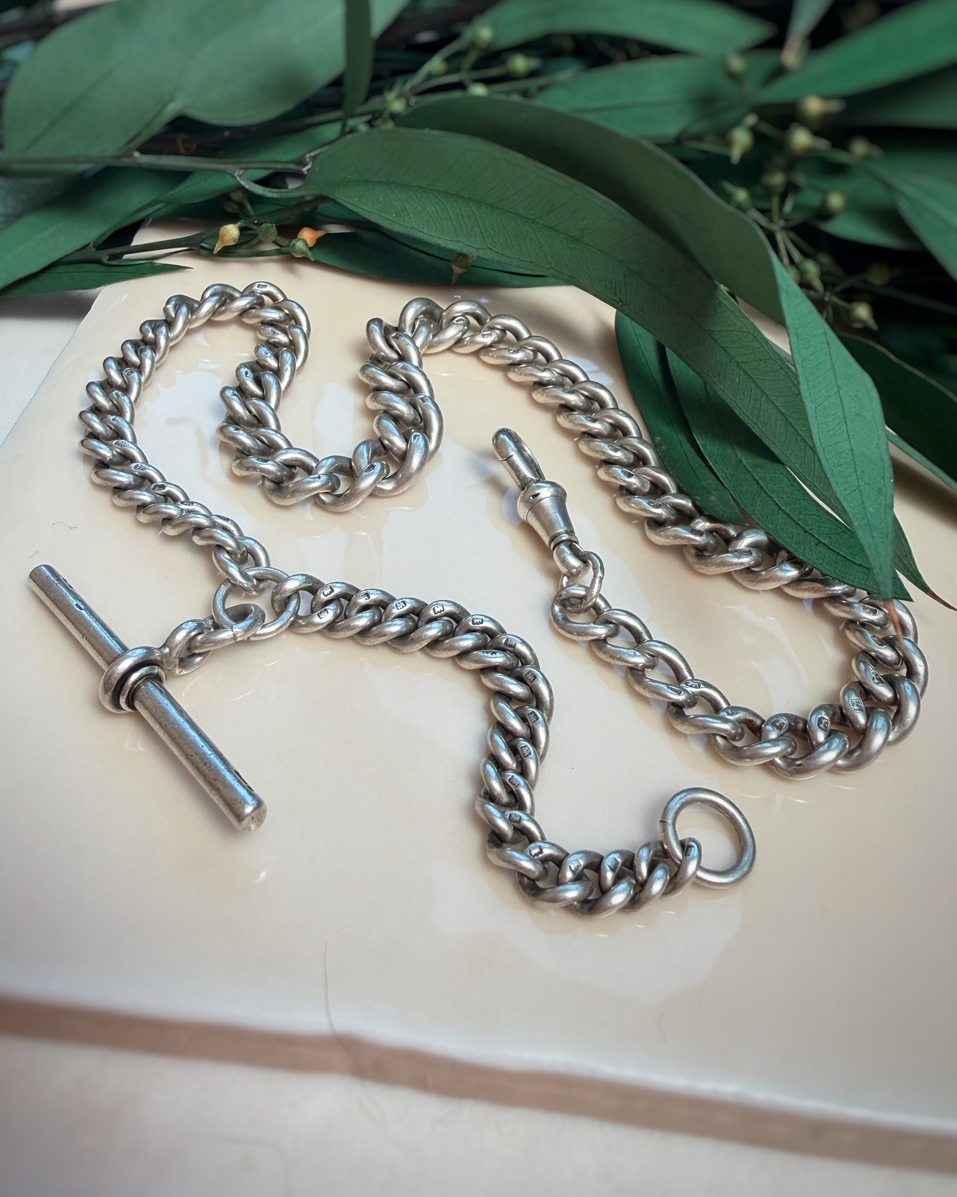 SHEESH. If you've been craving a BIGGGGG Albert, and I mean BIGGGG this is full on thrill. At up to 9mm wide, they don't come much chunkier than this, but the graceful sweep of her graduation means you don't look like you're fully wearing a bike lock. The links are in stunning condition, still plump and full and super well-tessellated. The dog clip being at the 3/4 position means you have an extra spot to hang charms and can have both the dog and T-Bar on display. She celebrated her 130th birthday this year and could easily go on to celebrate her 200th in your care.