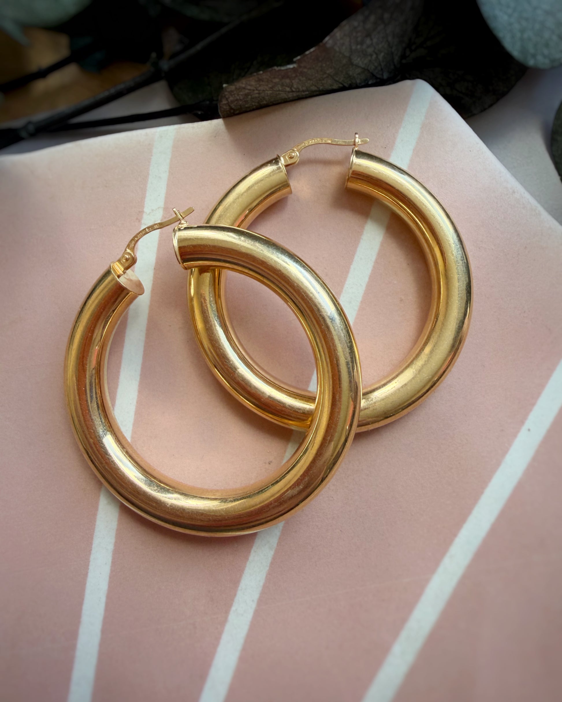 The gold hoop, perfected. These ultra large, chubby tubular hoops are the timeless kind — clean, bold, and impossible to improve upon. Their perfect proportions and sunny yellow gold strike that sweet spot between classic and cool. Vintage examples this good are surprisingly hard to find, so these are a real catch. They do everything you want a hoop to do: frame the face, lift the mood, and go with absolutely everything.
