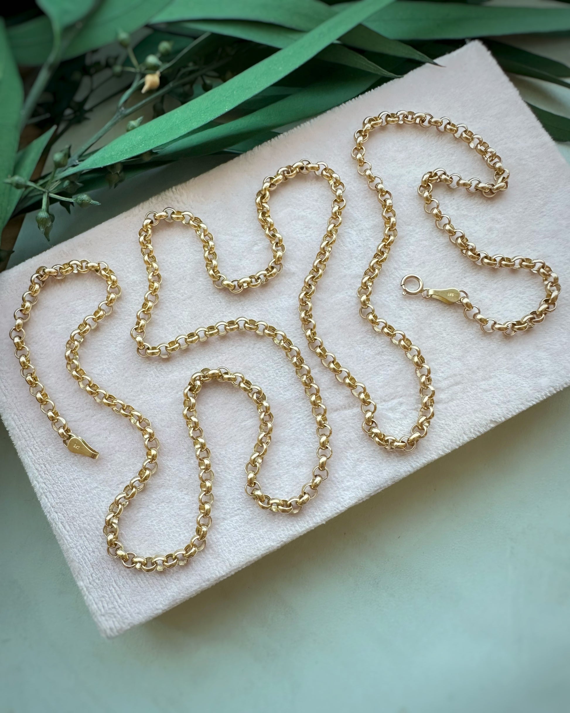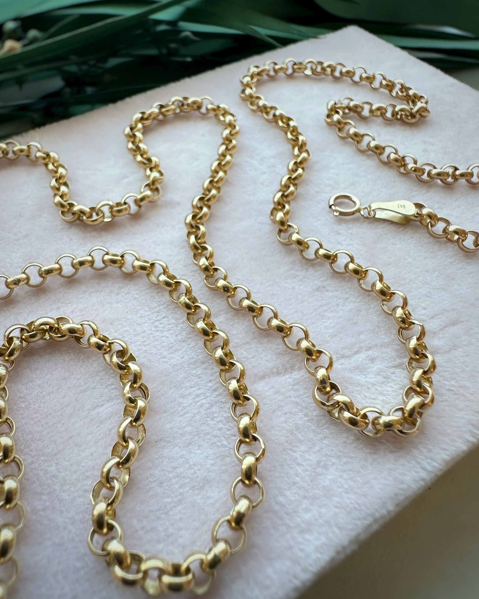 She’s vintage, she’s puffy, and she’s perfect. This long-length belcher has that gloriously rich yellow tone that only older gold gets — bright but buttery, never brassy. The links are satisfyingly rounded and in fantastic condition, making her as sturdy as she is cool.
